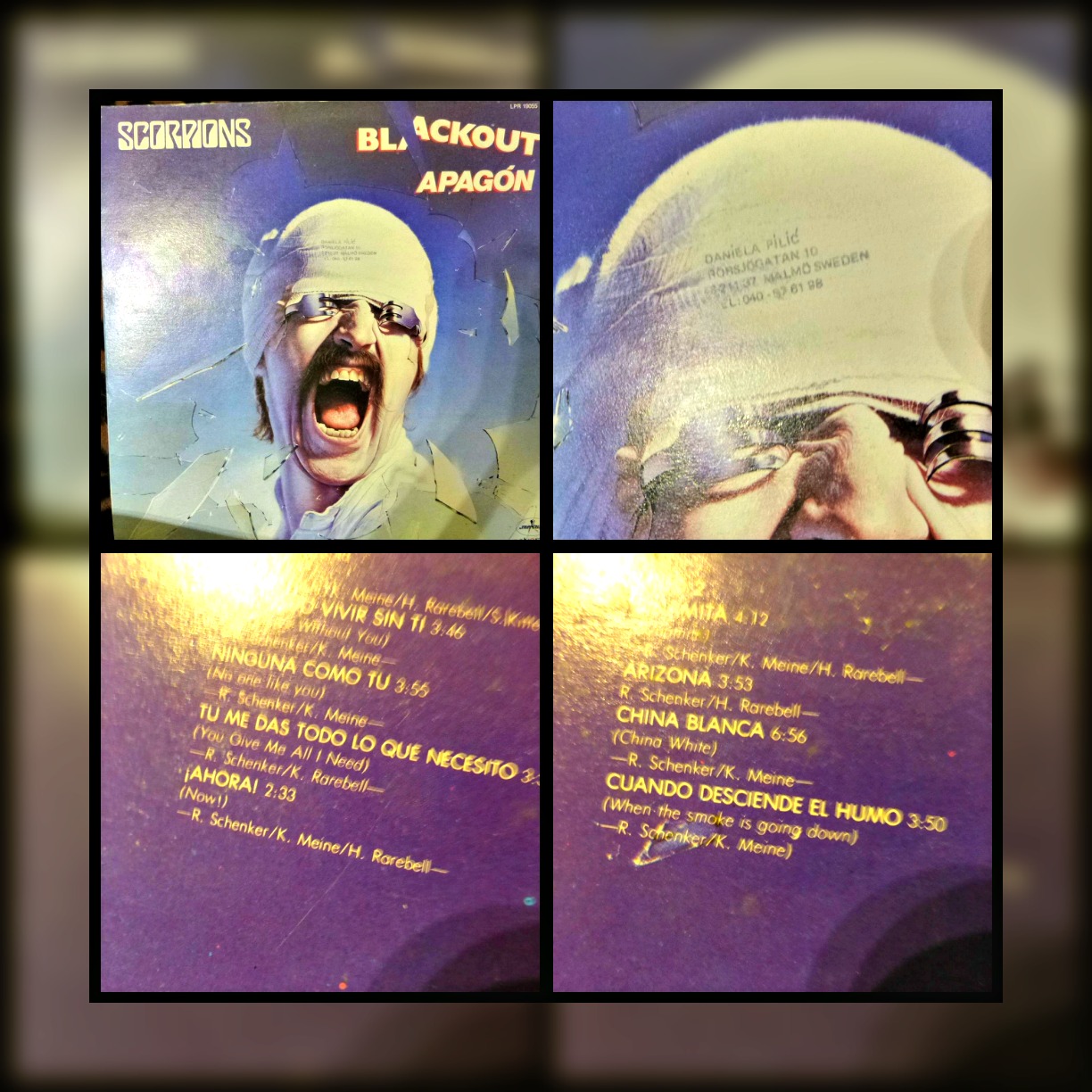 I would go and buy those cheap LP’s with cut-outs from Spain, cause I couldn’t afford anything else. I remember buying Scorpions “Blackout” and it had all the titles translated! Hang on, I’ve still got all that shit here…. Yeah, this is what it looked like: