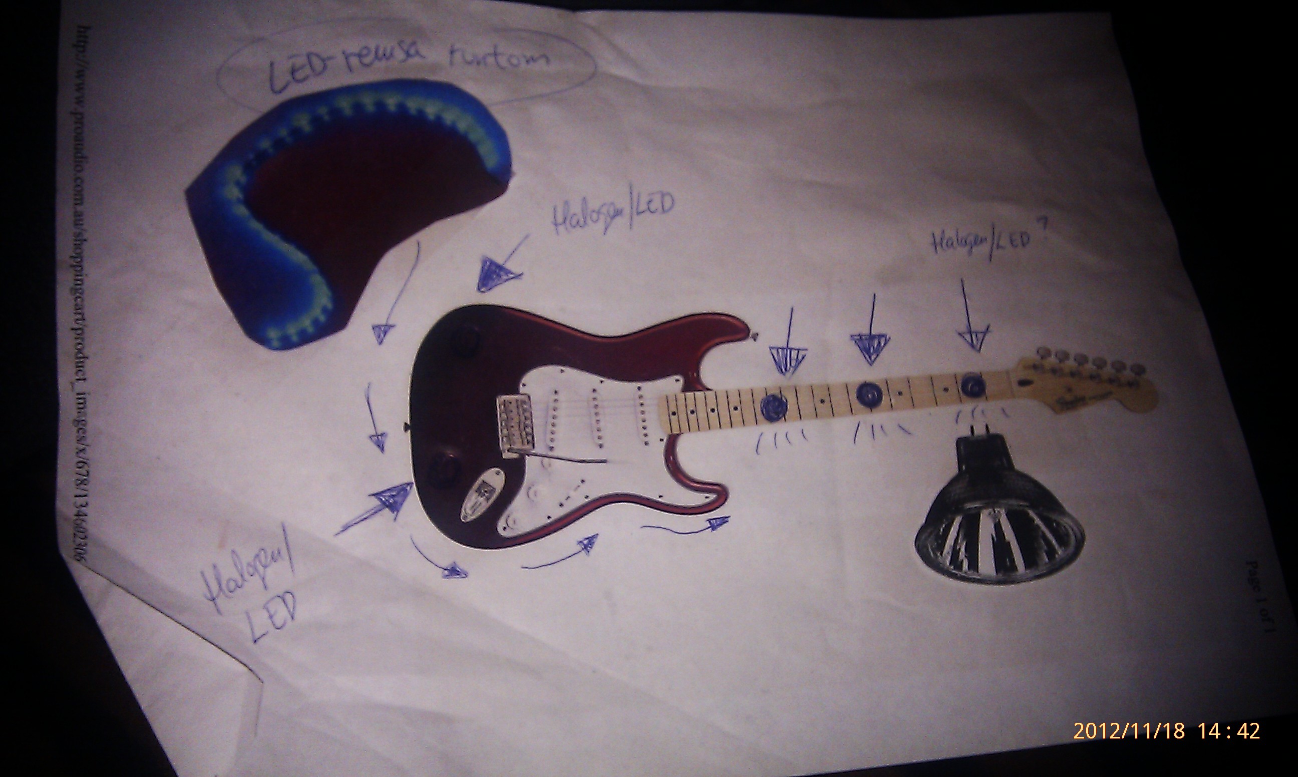 It was explained to me that I would only be able to use LED-lights as those were the only kind of light-source that didn’t produce heat. Otherwise it would be a problem as the guitar is made of wood.